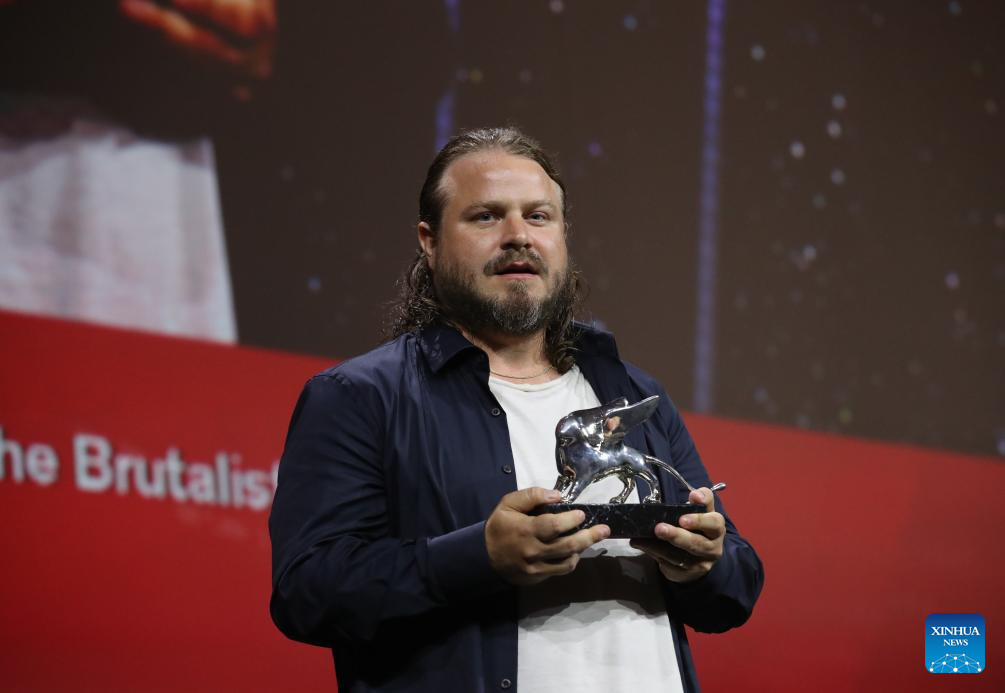 VENECIA, 8 septiembre, 2024 (Xinhua) -- Imagen del 7 de septiembre de 2024 del director estadounidense Brady Corbet posando con el Premio León de Oro a Mejor Director por la película "The Brutalist" en la ceremonia de premiación del 81° Festival de Cine de Venecia, en Venecia, Italia. El 81° Festival de Cine de Venecia se clausuró aquí el sábado. (Xinhua/Li Jing)