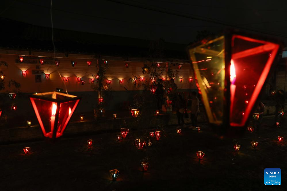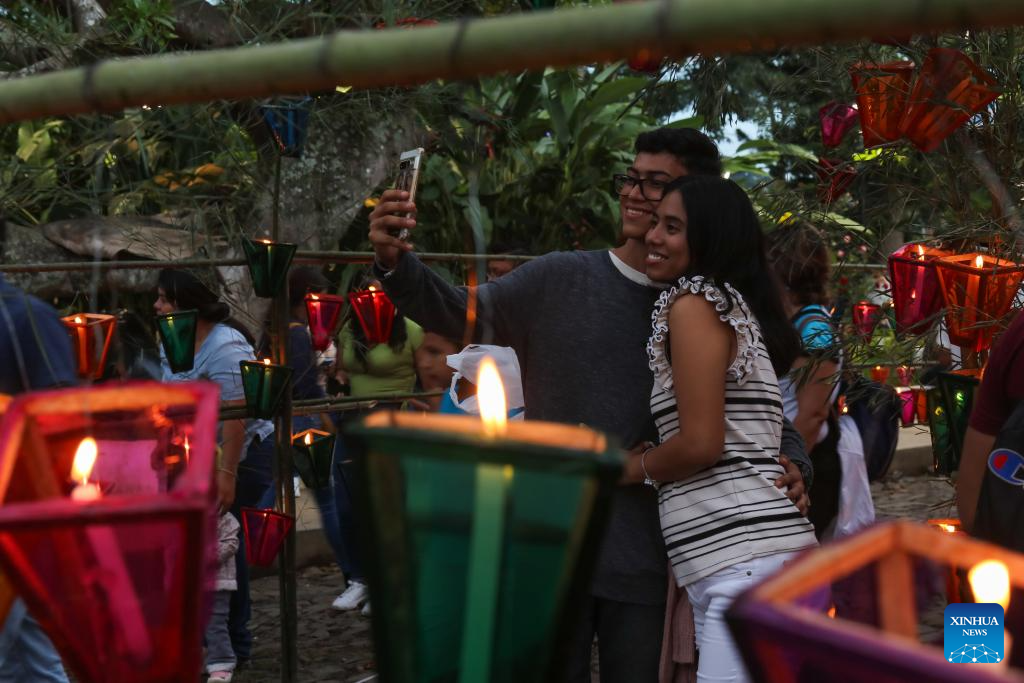 AHUACHAPAN, 8 septiembre, 2024 (Xinhua) -- Imagen del 7 de septiembre de 2024 de personas observando adornos con velas encendidas durante el Festival de los Farolitos, en el municipio de Concepción de Ataco, en el departamento de Ahuachapán, El Salvador. (Xinhua/Alexander Peña)