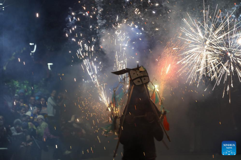 AHUACHAPAN, 8 septiembre, 2024 (Xinhua) -- Imagen del 7 de septiembre de 2024 de un hombre cargando una estructura con fuegos pirotécnicos durante el Festival de los Farolitos, en el municipio de Concepción de Ataco, en el departamento de Ahuachapán, El Salvador. (Xinhua/Alexander Peña)