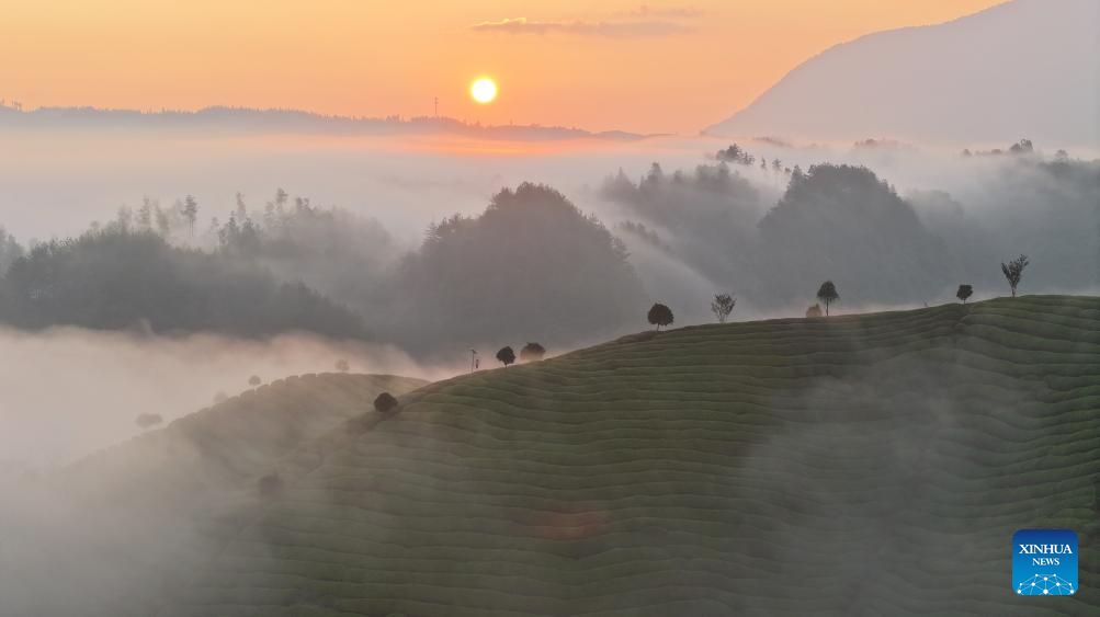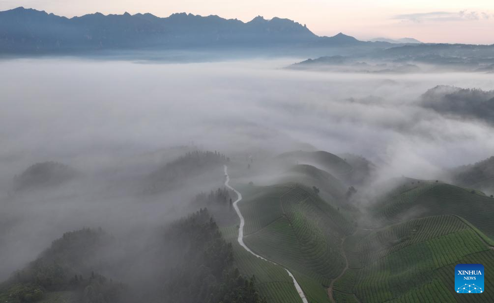 HEFENG, 9 septiembre, 2024 (Xinhua) -- Vista aérea tomada con un dron el 9 de septiembre de 2024 de un jardín de té en la Montaña Mu'er, en el poblado de Zouma del distrito de Hefeng, en la provincia de Hubei, en el centro de China. (Xinhua/Yang Shunpi)