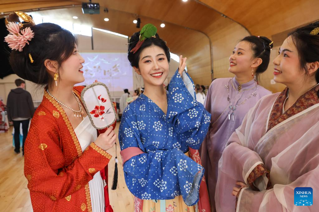 LONDRES, 9 septiembre, 2024 (Xinhua) -- Imagen del 8 de septiembre de 2024 de entusiastas del "Hanfu" asistiendo a un evento de exhibición de "Hanfu" llevado a cabo para celebrar el próximo Festival de Medio Otoño, en Londres, Reino Unido. (Xinhua)