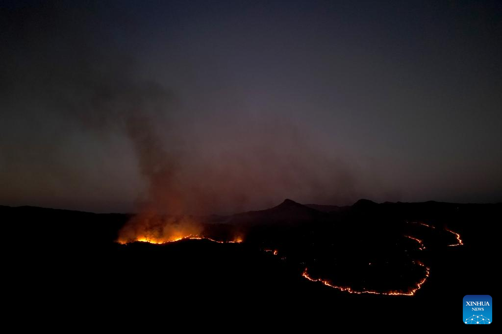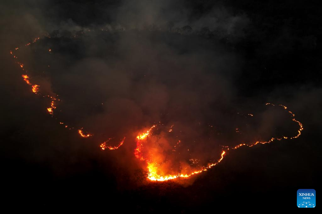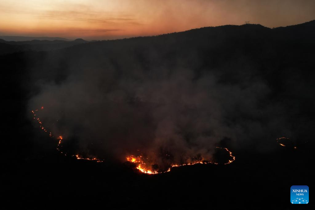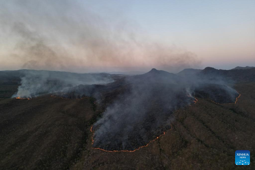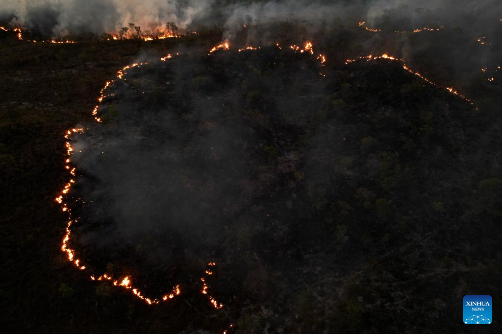 GOIAS, 10 septiembre, 2024 (Xinhua) -- Imagen tomada con un dron el 9 de septiembre de 2024 de un incendio forestal en el Area de Preservación Permanente en el lado occidental del Parque Nacional Chapada dos Veadeiros, en el estado de Goiás, Brasil. (Xinhua/Lucio Tavora)