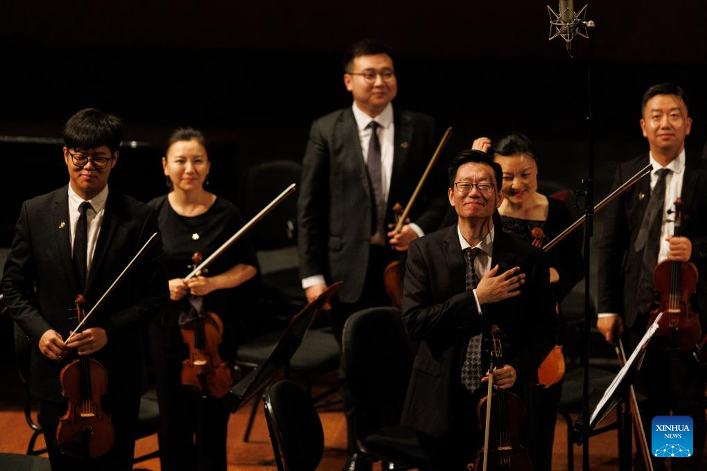 RIO DE JANEIRO, 10 septiembre, 2024 (Xinhua) -- Imagen del 9 de septiembre de 2024 del concertino de la Orquesta Sinfónica Nacional de China, el violinista Yao Liang (d-frente), agradeciendo al público al término de su presentación en el Teatro Municipal, en Río de Janeiro, Brasil. (Xinhua/Claudia Martini)