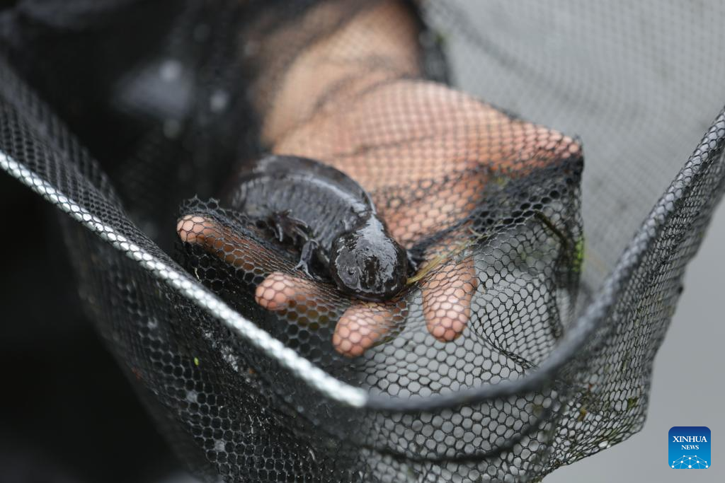 CIUDAD DE MEXICO, 10 septiembre, 2024 (Xinhua) -- Una persona sostiene un ajolote liberado en un humedal durante la inauguración del Recinto de Animales Acuáticos Anemitilkalli del Laboratorio de Especies Acuáticas Acuícolas perteneciente al Centro para la Preservación de la Biodiversidad de la Ciudad de México, en la Ciudad de México, capital de México, el 10 de septiembre de 2024. (Xinhua/Francisco Cañedo)