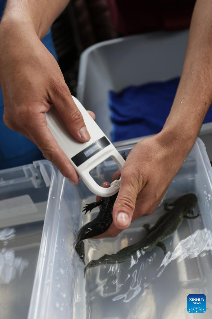 CIUDAD DE MEXICO, 10 septiembre, 2024 (Xinhua) -- Una persona se prepara para colocar un chip a un ajolote durante la inauguración del Recinto de Animales Acuáticos Anemitilkalli del Laboratorio de Especies Acuáticas Acuícolas perteneciente al Centro para la Preservación de la Biodiversidad de la Ciudad de México, en la Ciudad de México, capital de México, el 10 de septiembre de 2024. (Xinhua/Francisco Cañedo)