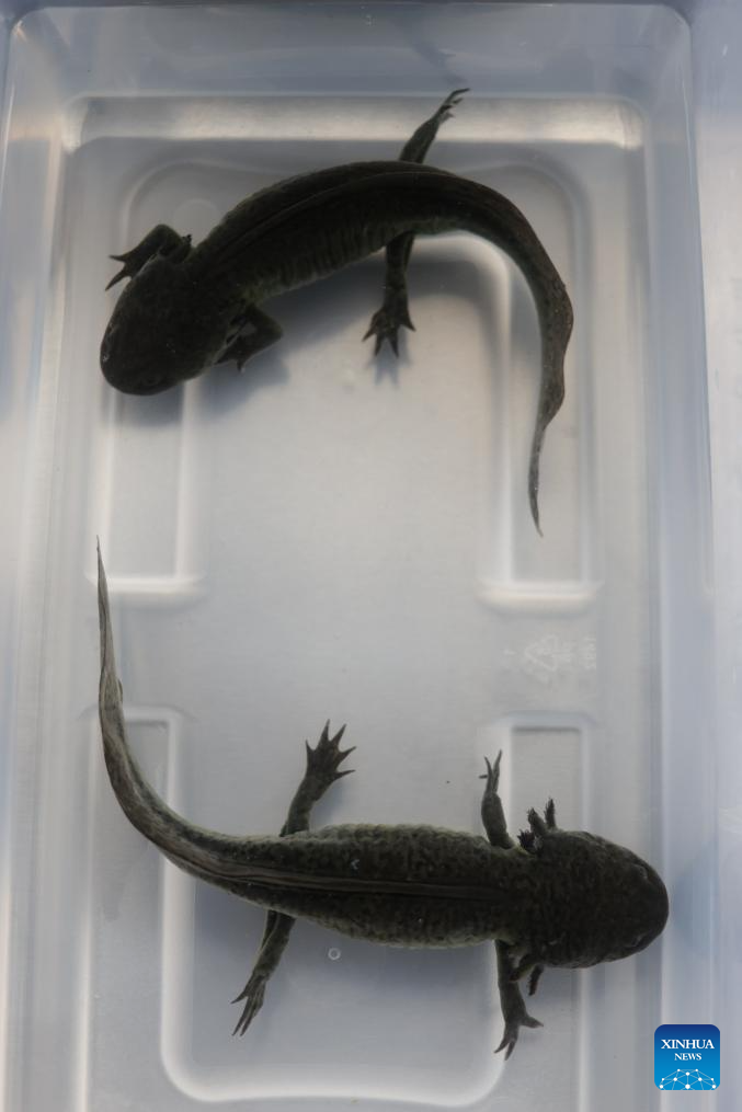 CIUDAD DE MEXICO, 10 septiembre, 2024 (Xinhua) -- Ajolotes son vistos en un contenedor durante la inauguración del Recinto de Animales Acuáticos Anemitilkalli del Laboratorio de Especies Acuáticas Acuícolas perteneciente al Centro para la Preservación de la Biodiversidad de la Ciudad de México, en la Ciudad de México, capital de México, el 10 de septiembre de 2024. (Xinhua/Francisco Cañedo)