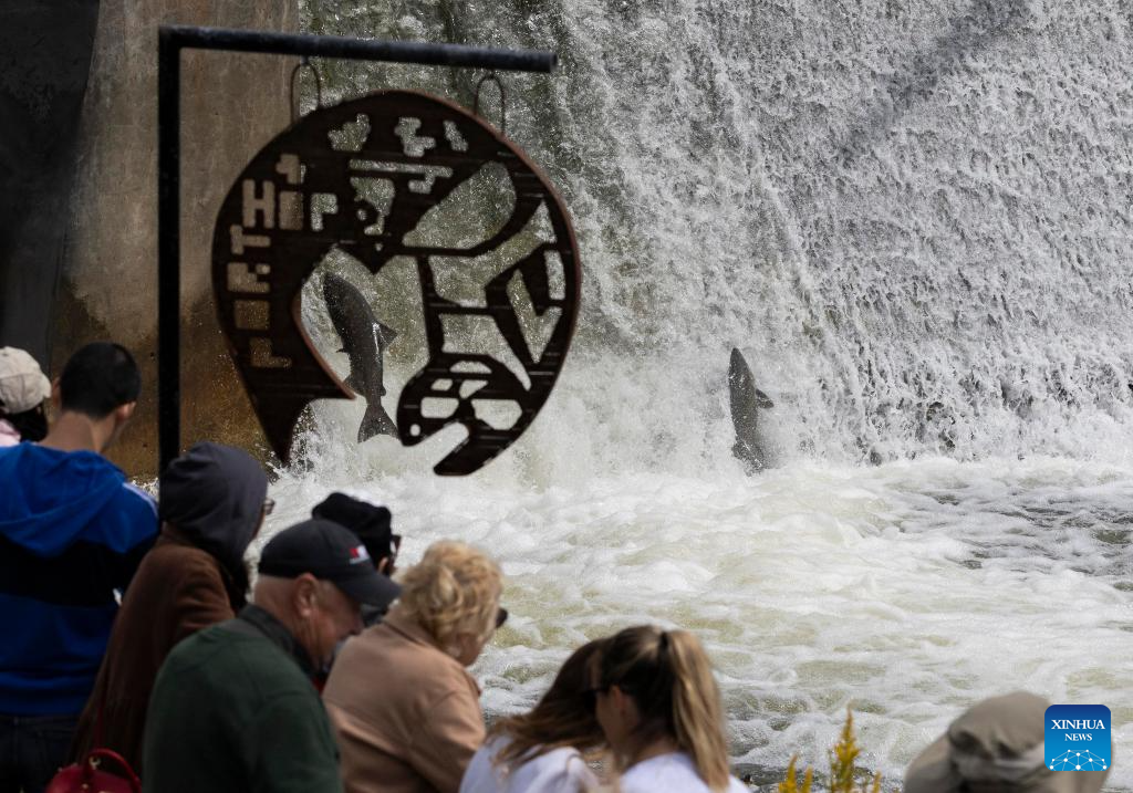 PORT HOPE, 9 septiembre, 2024 (Xinhua) -- Imagen del 8 de septiembre de 2024 de personas observando como los peces saltan río arriba durante su migración hacia las zonas de desove en el río Ganaraska, en Port Hope, Ontario, Canadá. (Xinhua/Zou Zheng)
