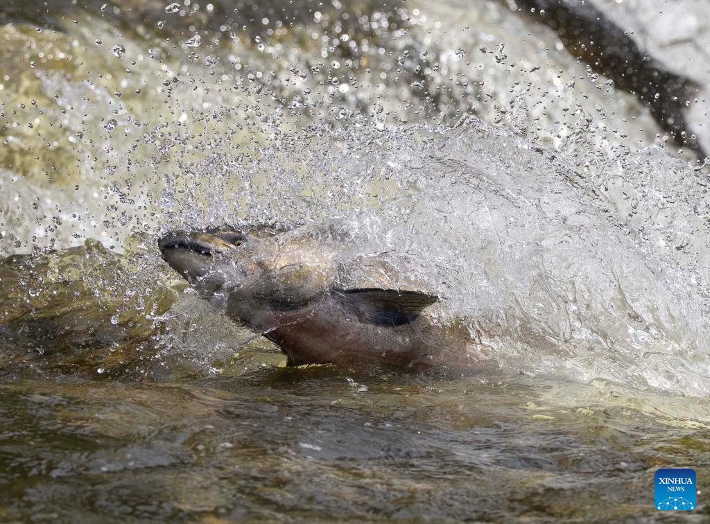 PORT HOPE, 9 septiembre, 2024 (Xinhua) -- Imagen del 8 de septiembre de 2024 de un pez nadando río arriba durante su migración hacia las zonas de desove en el río Ganaraska, en Port Hope, Ontario, Canadá. (Xinhua/Zou Zheng)