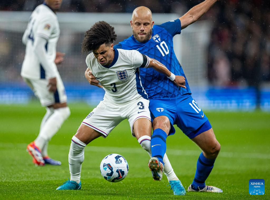 LONDRES, 11 septiembre, 2024 (Xinhua) -- Imagen del 10 de septiembre de 2024 de Rico Lewis (i-frente), de Inglaterra, disputando el balón con Teemu Pukki, de Finlandia, durante el partido del Grupo B2 de la Liga de las Naciones de la UEFA entre Inglaterra y Finlandia, en Londres, Reino Unido. (Xinhua)