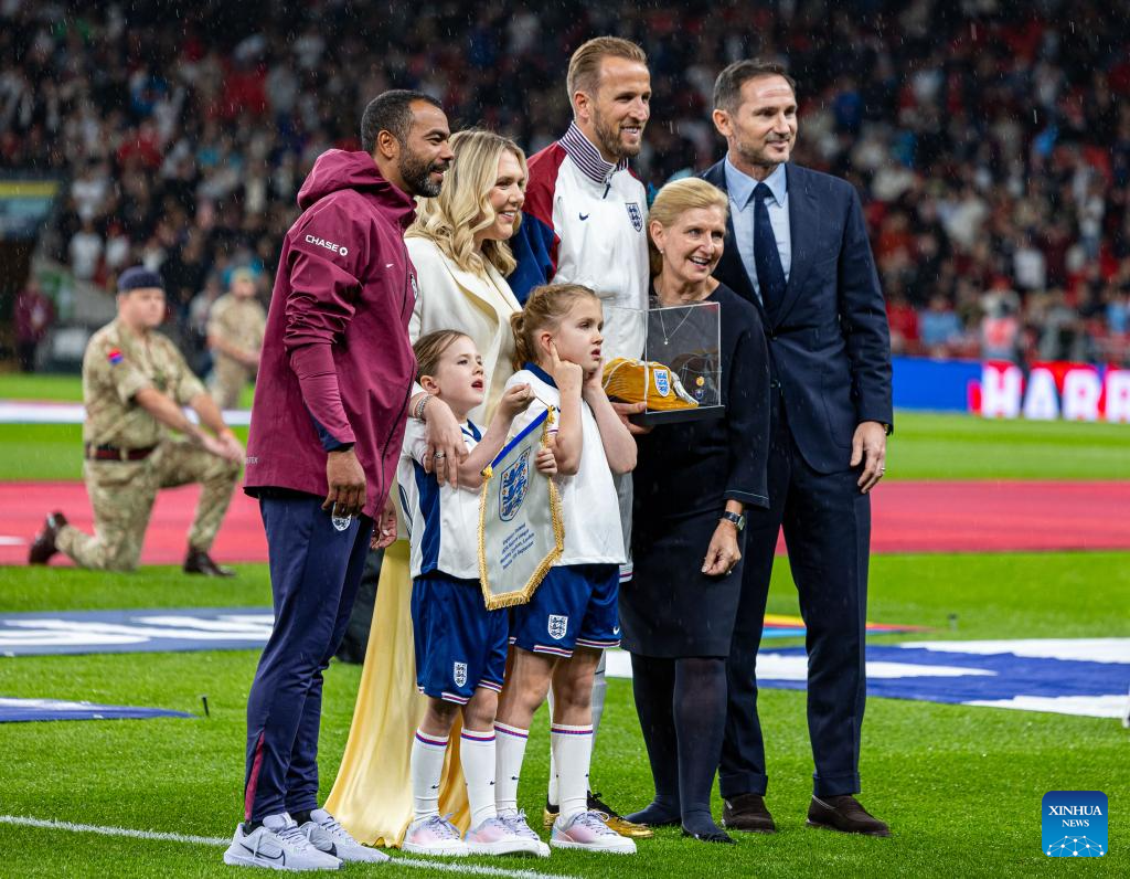 LONDRES, 11 septiembre, 2024 (Xinhua) -- Imagen del 10 de septiembre de 2024 de Harry Kane (3-d), de Inglaterra, siendo premiado con la gorra dorada por su aparición número 100 de parte del exjugador Frank Lampard (d) previo al partido del Grupo B2 de la Liga de las Naciones de la UEFA entre Inglaterra y Finlandia, en Londres, Reino Unido. (Xinhua)