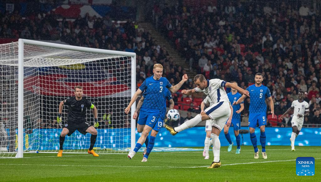 LONDRES, 11 septiembre, 2024 (Xinhua) -- Imagen del 10 de septiembre de 2024 de Harry Kane (3-i), de Inglaterra, disparando el balón durante el partido del Grupo B2 de la Liga de las Naciones de la UEFA entre Inglaterra y Finlandia, en Londres, Reino Unido. (Xinhua)
