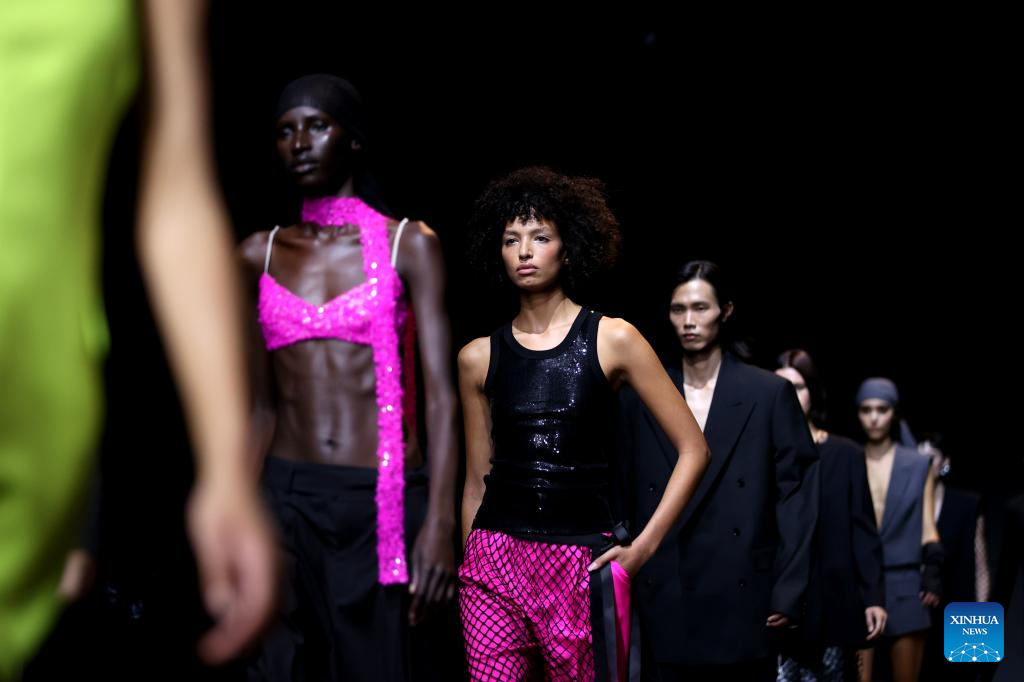 LONDRES, 13 septiembre, 2024 (Xinhua) -- Imagen del 12 de septiembre de 2024 de modelos presentando creaciones en el desfile "HU BING SELECTS" durante la Semana de la Moda de Londres, en Londres, Reino Unido. (Xinhua/Li Ying)