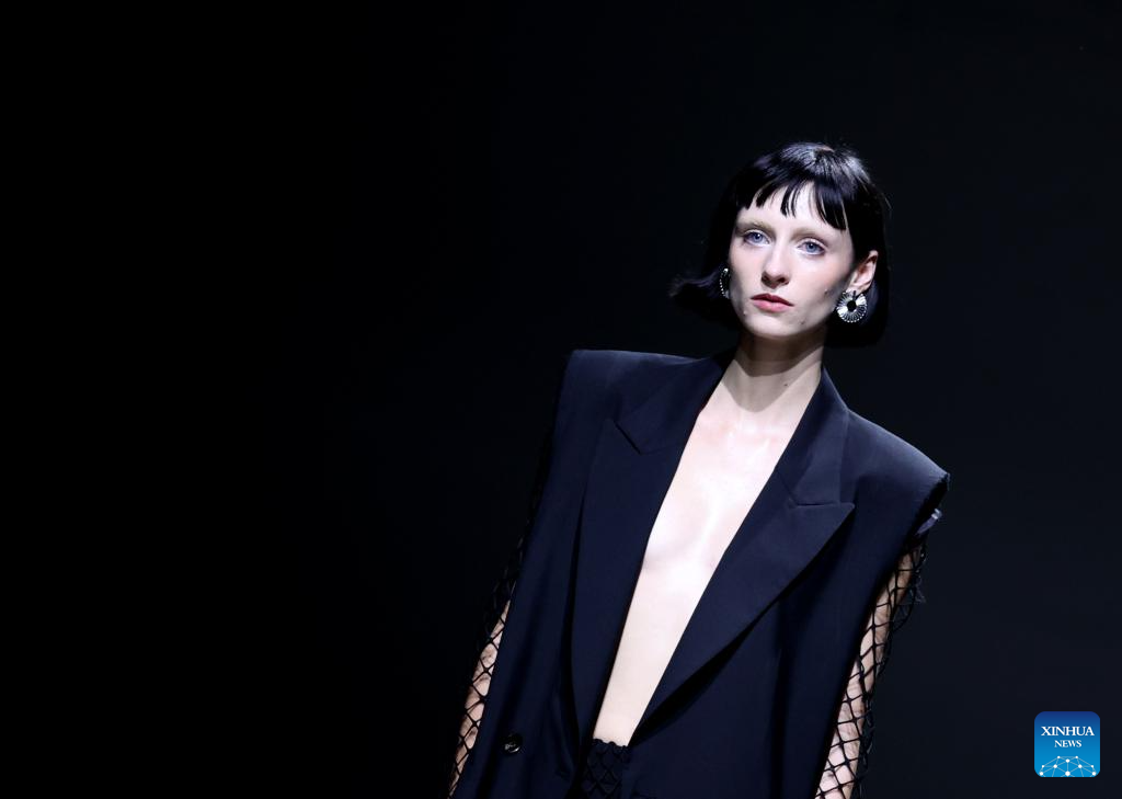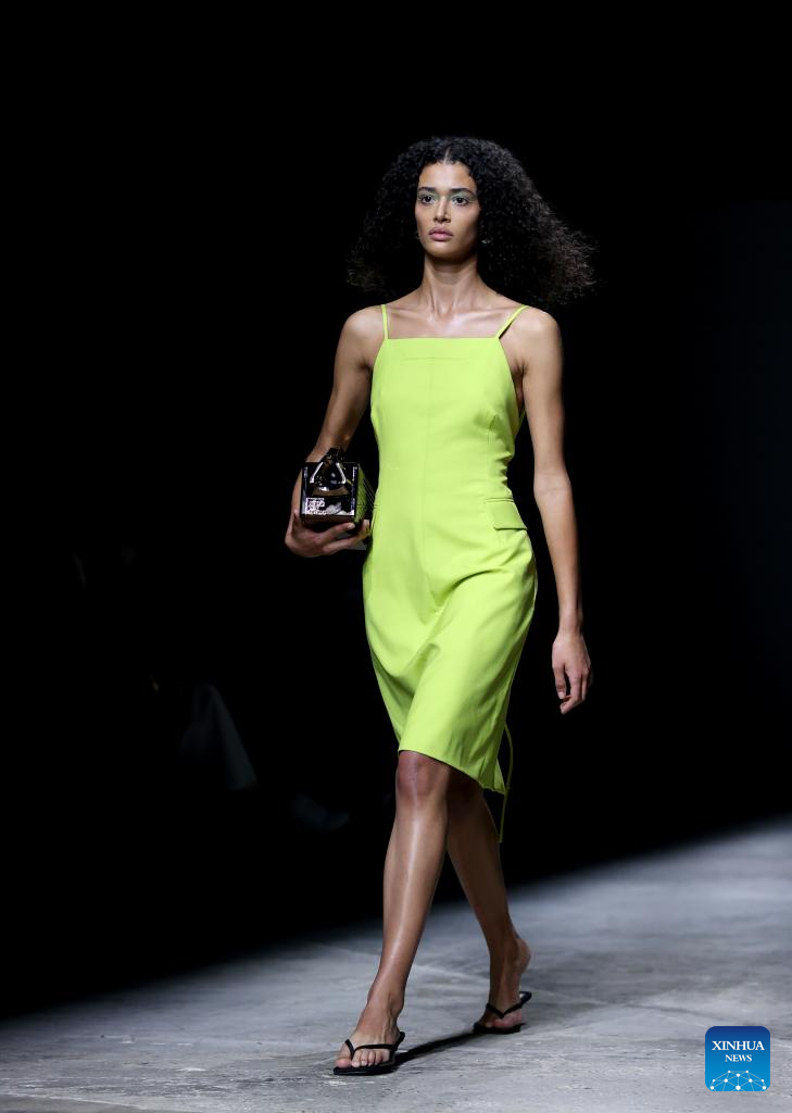 LONDRES, 13 septiembre, 2024 (Xinhua) -- Imagen del 12 de septiembre de 2024 de una modelo presentando una creación en el desfile "HU BING SELECTS" durante la Semana de la Moda de Londres, en Londres, Reino Unido. (Xinhua/Li Ying)