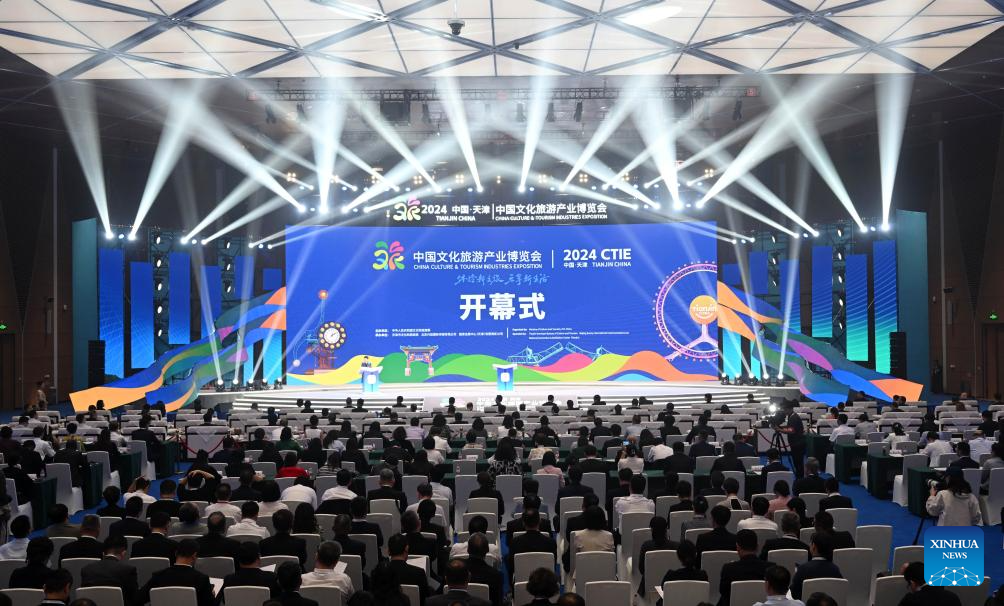 TIANJIN, 13 septiembre, 2024 (Xinhua) -- La ceremonia de inauguración de la Exposición de Industrias Culturales y Turísticas de China 2024 se lleva a cabo, en Tianjin, en el norte de China, el 13 de septiembre de 2024. La exposición de cuatro días de duración se inauguró aquí el viernes. Más de 2.000 empresas culturales y turísticas están participando, con espacios de experiencia inmersiva mostrando equipamientos para turismo inteligente y para actividades al aire libre, los logros en la integración profunda de la cultura y el turismo, así como el desarrollo de productos y servicios culturales innovadores. (Xinhua/Zhao Zishuo)
