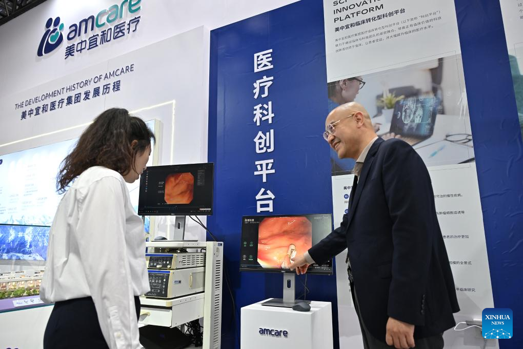 BEIJING, 13 septiembre, 2024 (Xinhua) -- Una visitante aprende sobre una plataforma médica de endoscopia gastrointestinal propulsada por IA durante la Feria Internacional de Comercio de Servicios de China 2024 (CIFTIS, por sus siglas en inglés), en el parque Shougang, en Beijing, capital de China, el 13 de septiembre de 2024. Bajo el lema "Servicios globales, prosperidad compartida", la CIFTIS 2024 se celebra en el Centro Nacional de Convenciones de China y el parque Shougang en Beijing del 12 al 16 de septiembre. (Xinhua/Li Xin)