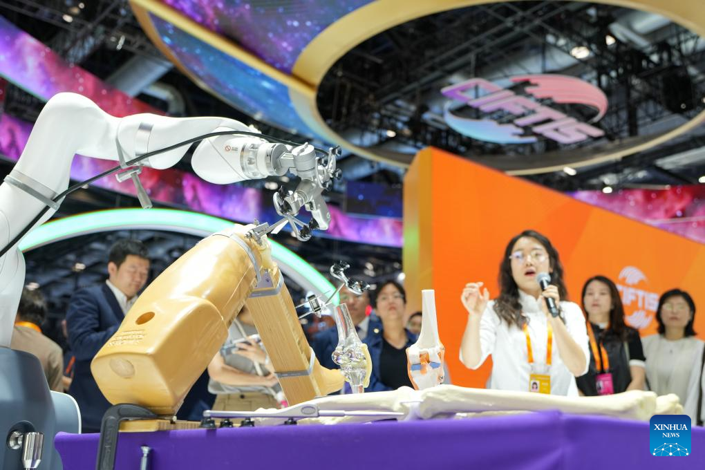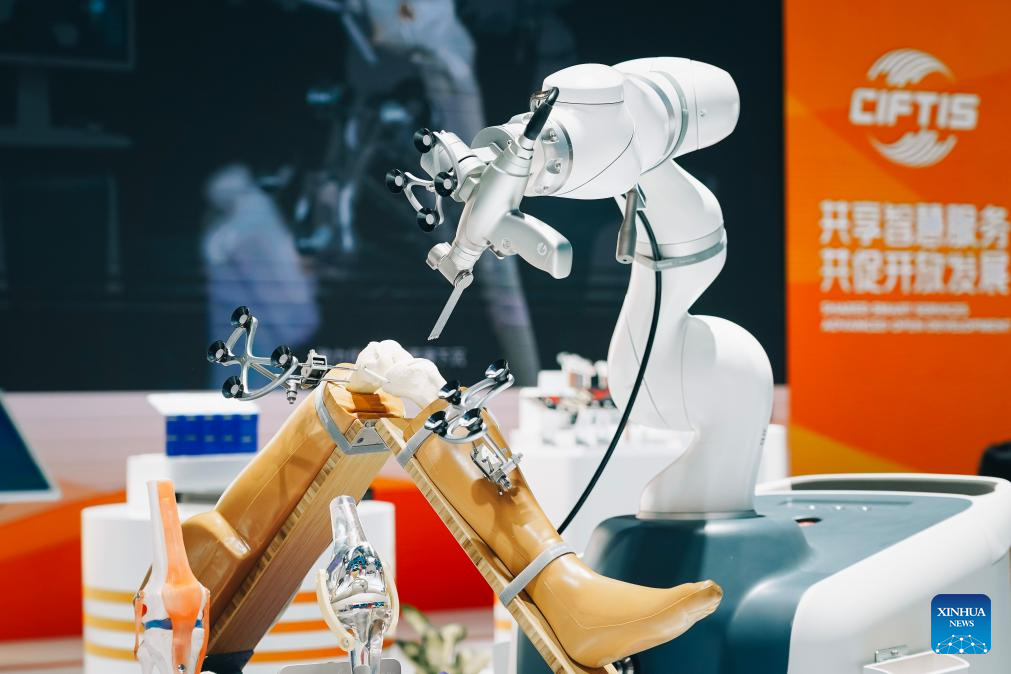 BEIJING, 13 septiembre, 2024 (Xinhua) -- Visitantes observan un robot quirúrgico ortopédico propulsado por IA durante la Feria Internacional de Comercio de Servicios de China 2024 (CIFTIS, por sus siglas en inglés), en el Centro Nacional de Convenciones de China, en Beijing, capital de China, el 13 de septiembre de 2024. Bajo el lema "Servicios globales, prosperidad compartida", la CIFTIS 2024 se celebra en el Centro Nacional de Convenciones de China y el parque Shougang en Beijing del 12 al 16 de septiembre. (Xinhua/Ju Huanzong)