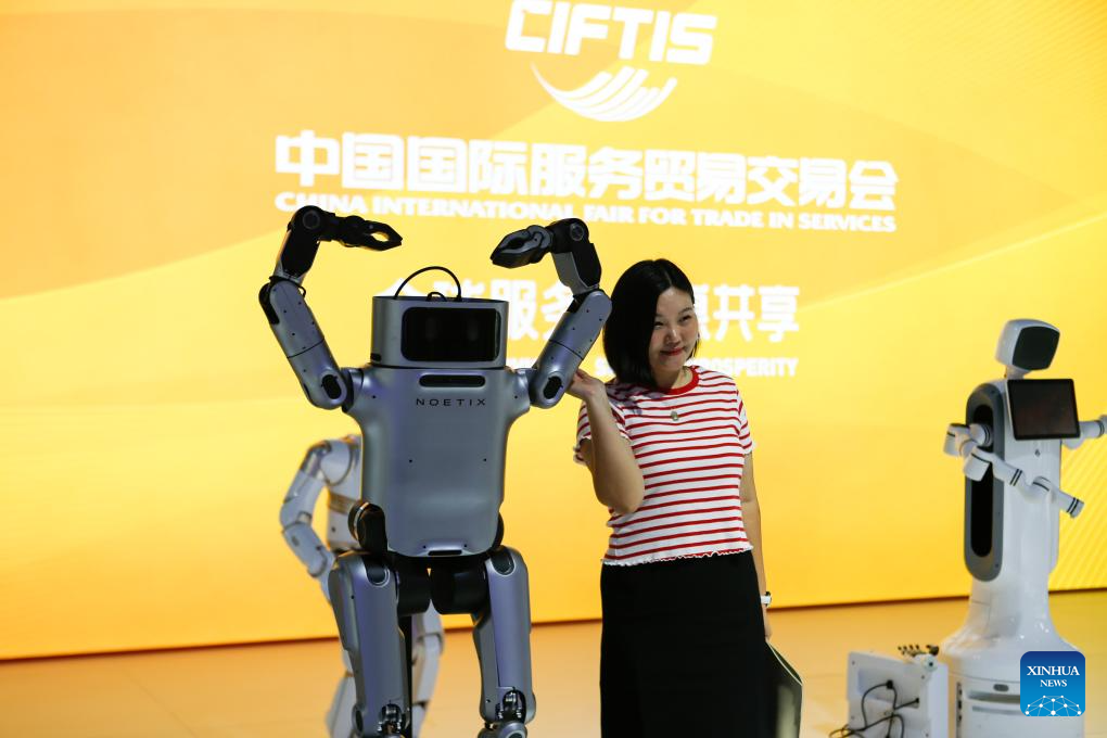 BEIJING, 13 septiembre, 2024 (Xinhua) -- Una visitante posa para fotografías con un robot durante la Feria Internacional de Comercio de Servicios de China 2024 (CIFTIS, por sus siglas en inglés), en el Centro Nacional de Convenciones de China, en Beijing, capital de China, el 13 de septiembre de 2024. Bajo el lema "Servicios globales, prosperidad compartida", la CIFTIS 2024 se celebra en el Centro Nacional de Convenciones de China y el parque Shougang en Beijing del 12 al 16 de septiembre. (Xinhua/Ding Hongfa)