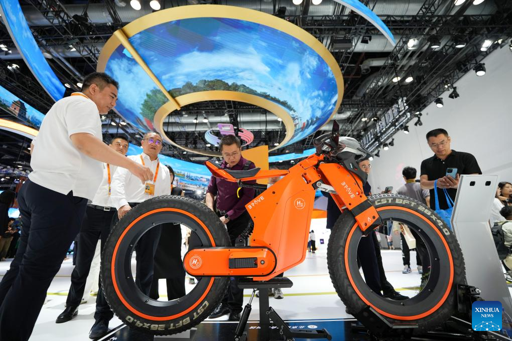 BEIJING, 13 septiembre, 2024 (Xinhua) -- Personas observan una motocicleta propulsada por hidrógeno exhibida durante la Feria Internacional de Comercio de Servicios de China 2024 (CIFTIS, por sus siglas en inglés), en el Centro Nacional de Convenciones de China, en Beijing, capital de China, el 13 de septiembre de 2024. Bajo el lema "Servicios globales, prosperidad compartida", la CIFTIS 2024 se celebra en el Centro Nacional de Convenciones de China y el parque Shougang en Beijing del 12 al 16 de septiembre. (Xinhua/Ju Huanzong)