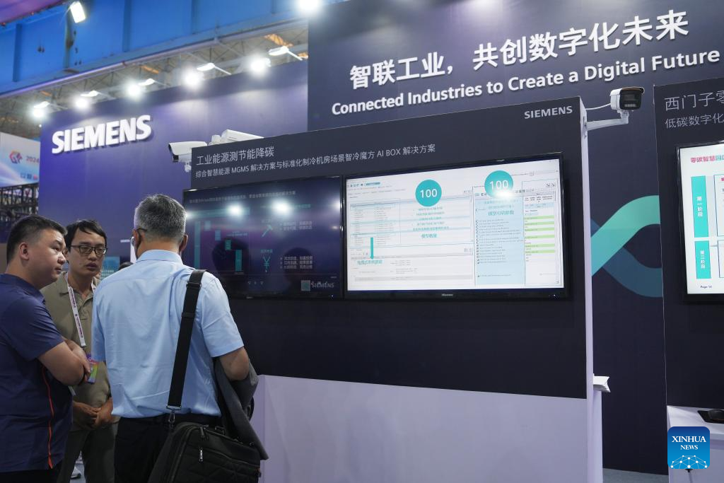 SHENYANG, 13 septiembre, 2024 (Xinhua) -- Imagen del 12 de septiembre de 2024 de personas visitando el estand de Siemens en una exposición de logros de innovación de la Conferencia Global de Internet Industrial 2024, en Shenyang, en la provincia de Liaoning, en el noreste de China. La Conferencia Global de Internet Industrial 2024 comenzó aquí el jueves. (Xinhua/Zhang Lei)