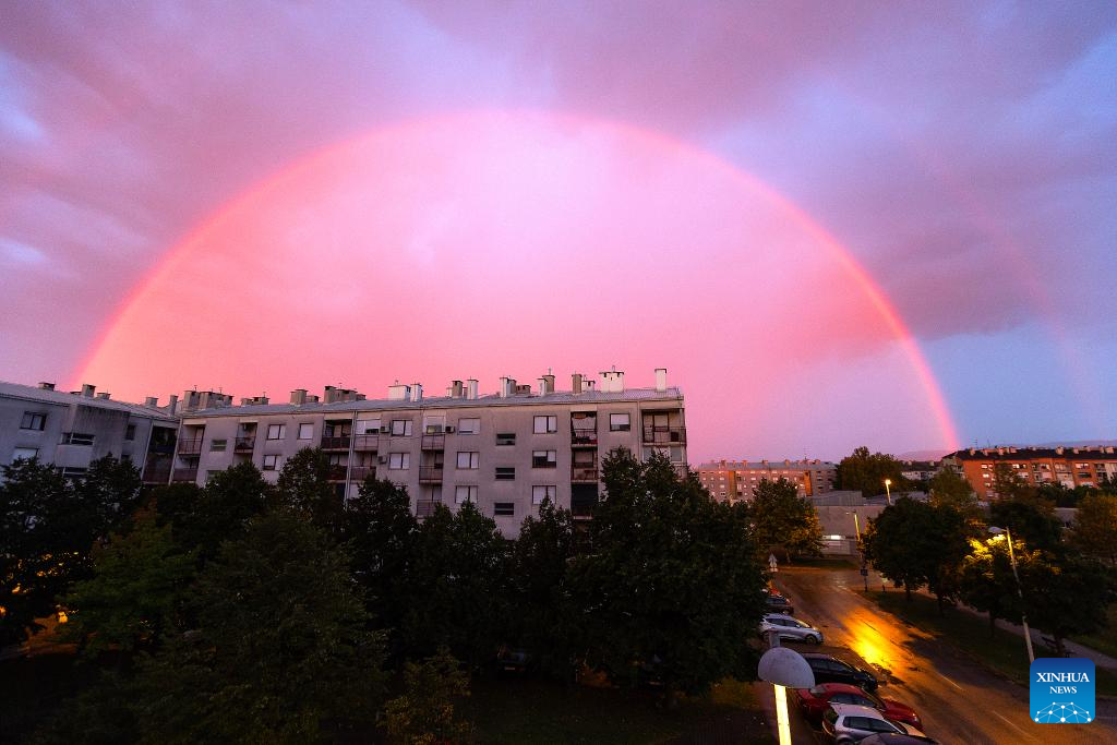 ZAGREB, 12 septiembre, 2024 (Xinhua) -- Un arcoíris es visto al amanecer, en Zagreb, Croacia, el 12 de septiembre de 2024. (Xinhua/Patrik Macek/PIXSELL)