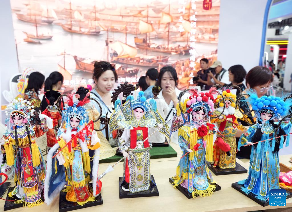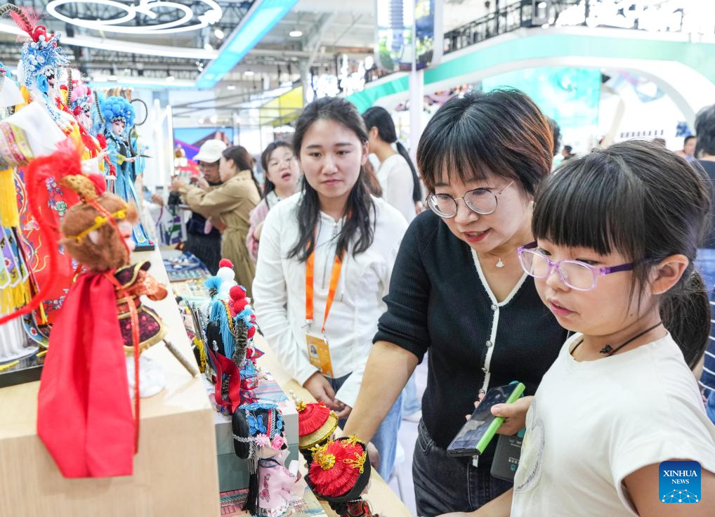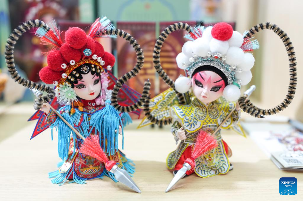 BEIJING, 15 septiembre, 2024 (Xinhua) -- Productos culturales creativos con temática de ópera tradicional son vistos en el estand de exhibición del distrito de Tongzhou de Beijing durante la Feria Internacional de Comercio de Servicios de China 2024 (CIFTIS, por sus siglas en inglés) en el parque Shougang, en Beijing, capital de China, el 15 de septiembre de 2024. Varios productos culturales creativos se exhibieron en el área de exposición temática de Servicios Culturales y Turísticos y atrajeron a muchos a echar un vistazo el domingo, primer día de puertas abiertas de la CIFTIS de este año. (Xinhua/Chen Yehua)