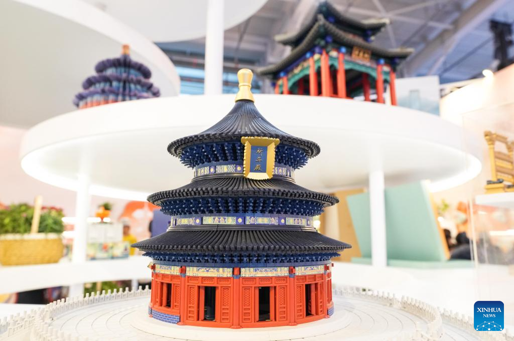 BEIJING, 15 septiembre, 2024 (Xinhua) -- Un producto creativo cultural (frente) temático del Salón de Oración por las Buenas Cosechas, o Qiniandian del Parque Tiantan (Templo del Cielo) es visto durante la Feria Internacional de Comercio de Servicios de China 2024 (CIFTIS, por sus siglas en inglés) en el Parque Shougang, en Beijing, capital de China, el 15 de septiembre de 2024. Varios productos culturales creativos se exhibieron en el área de exposición temática de Servicios Culturales y Turísticos y atrajeron a muchos a echar un vistazo el domingo, primer día de puertas abiertas de la CIFTIS de este año. (Xinhua/Chen Yehua)