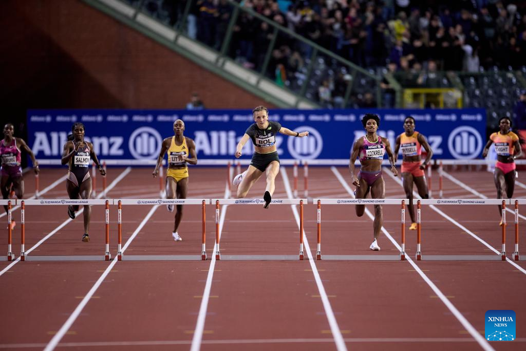 BRUSELAS, 15 septiembre, 2024 (Xinhua) -- Imagen del 14 de septiembre de 2024 de Femke Bol (c), de Países Bajos, corriendo durante la final de 400m con vallas femenino en la Reunión de Bruselas de la Liga de Diamante 2024, en Bruselas, Bélgica. (Xinhua/Meng Dingbo)