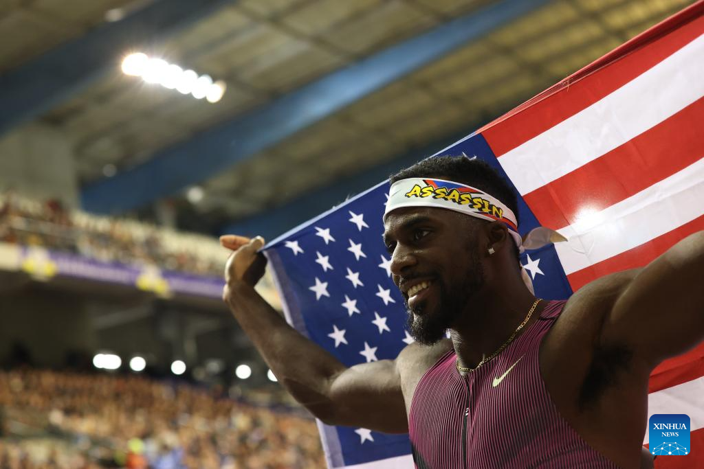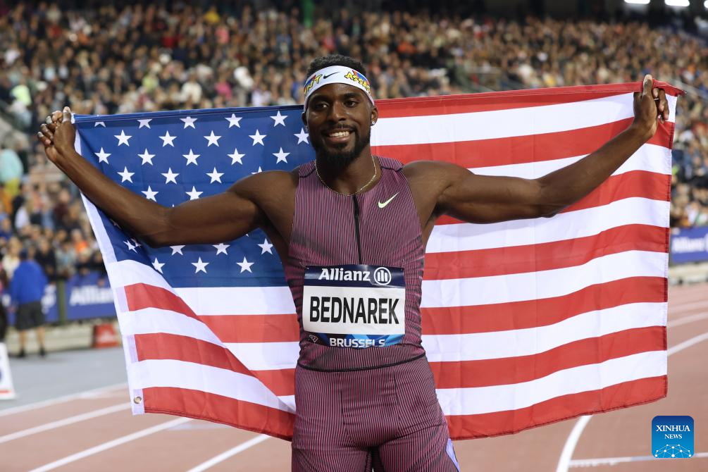 BRUSELAS, 15 septiembre, 2024 (Xinhua) -- Imagen del 14 de septiembre de 2024 de Kenneth Bednarek, de Estados Unidos, festejando después de ganar la final de 200m masculinos en la Reunión de Bruselas de la Liga de Diamante 2024, en Bruselas, Bélgica. (Xinhua/Zhao Dingzhe)
