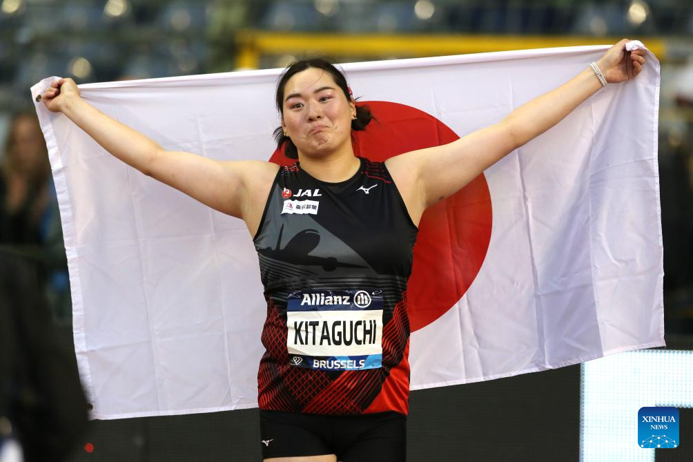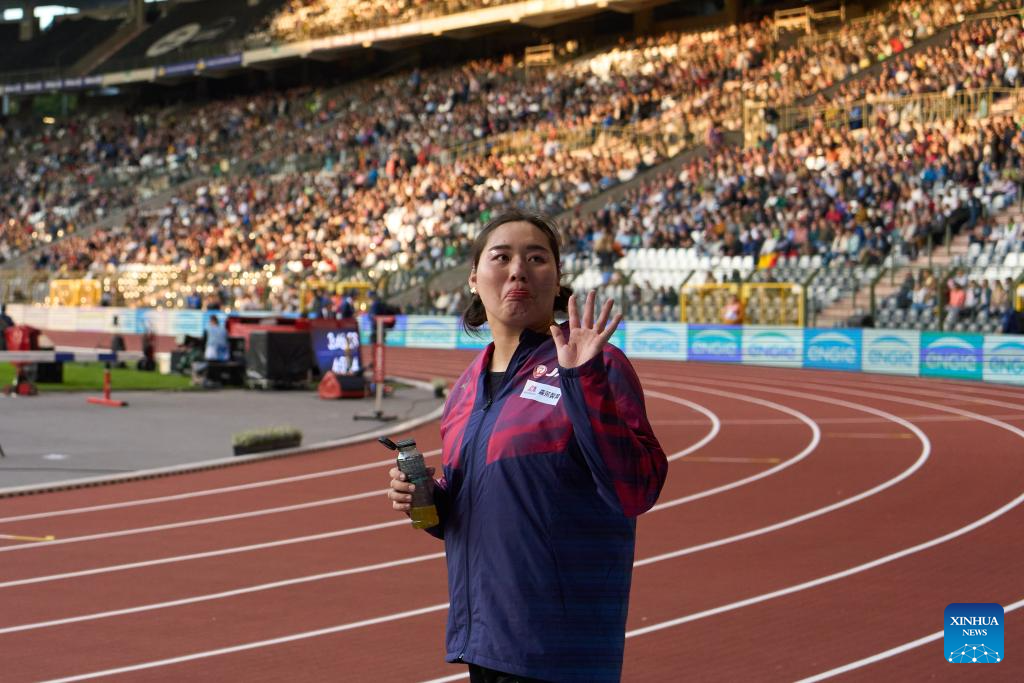 BRUSELAS, 15 septiembre, 2024 (Xinhua) -- Imagen del 14 de septiembre de 2024 de Kitaguchi Haruka, de Japón, festejando después de ganar la final de lanzamiento de jabalina femenino en la Reunión de Bruselas de la Liga de Diamante 2024, en Bruselas, Bélgica. (Xinhua/Zhao Dingzhe)