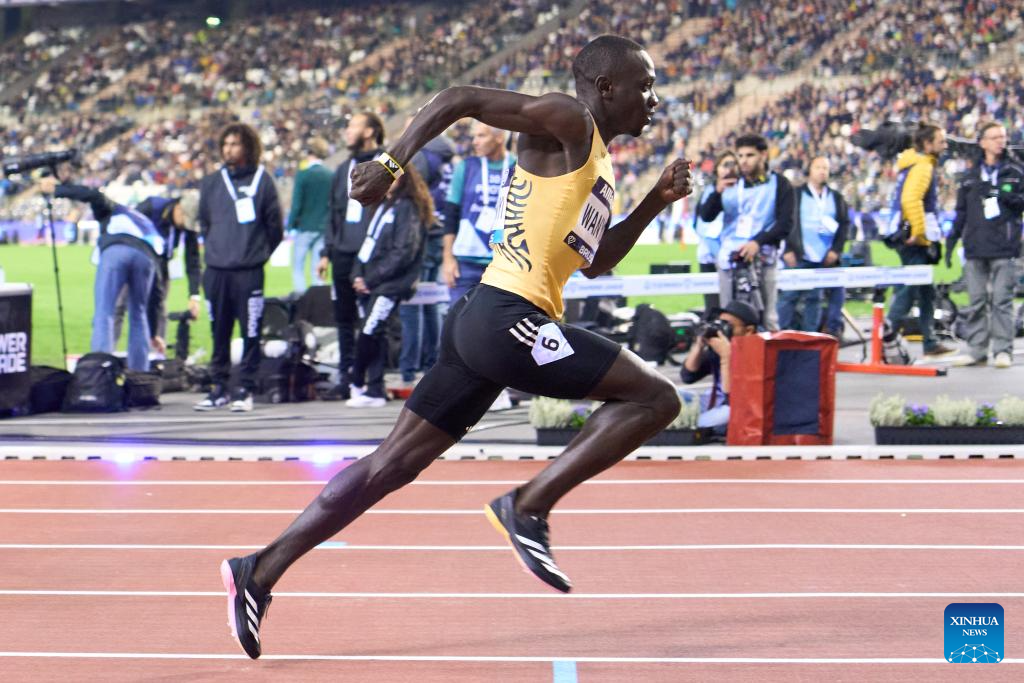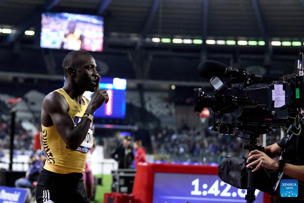 BRUSELAS, 15 septiembre, 2024 (Xinhua) -- Imagen del 14 de septiembre de 2024 de Emmanuel Wanyonyi, de Kenia, festejando después de ganar la final de 800m masculinos en la Reunión de Bruselas de la Liga de Diamante 2024, en Bruselas, Bélgica. (Xinhua/Meng Dingbo)