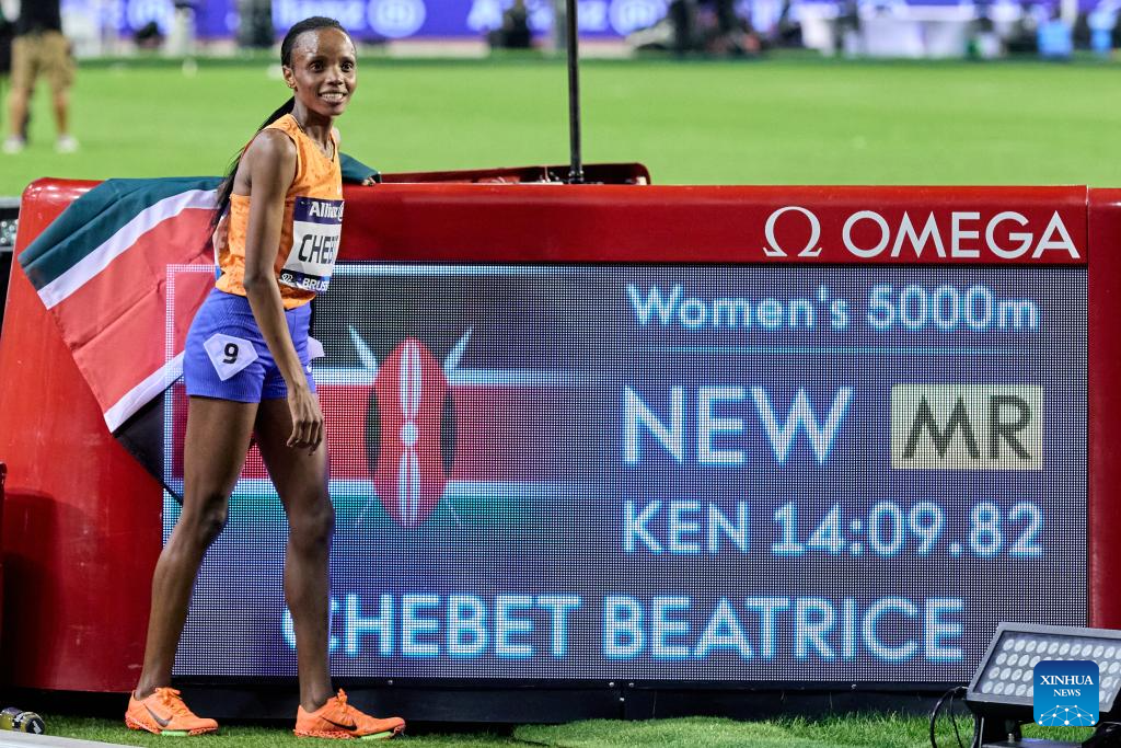 BRUSELAS, 15 septiembre, 2024 (Xinhua) -- Imagen del 14 de septiembre de 2024 de Beatrice Chebet, de Kenia, festejando después de ganar la final de 5000m femeninos en la Reunión de Bruselas de la Liga de Diamante 2024, en Bruselas, Bélgica. (Xinhua/Meng Dingbo)