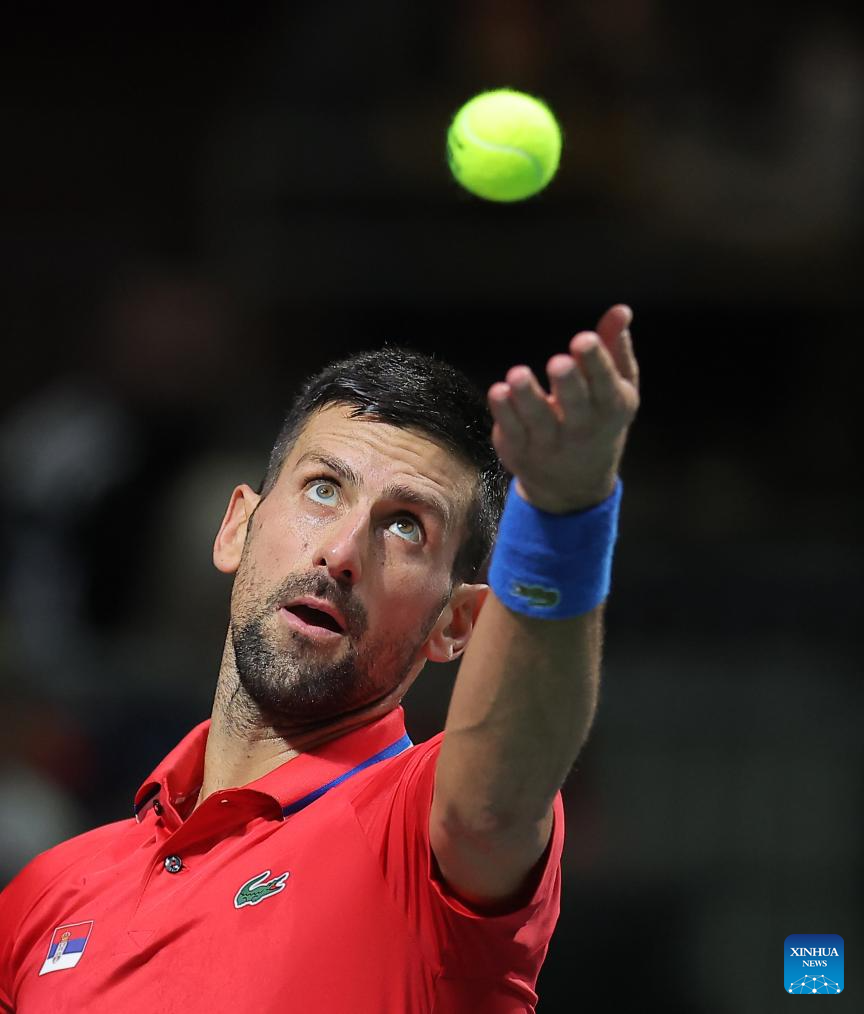 BELGRADO, 15 septiembre, 2024 (Xinhua) -- Imagen del 14 de septiembre de 2024 de Novak Djokovic, de Serbia, sirviendo la pelota a Ioannis Xilas, de Grecia, durante el partido de tenis del Grupo Mundial 1 de la Copa Davis entre Serbia y Grecia, en Belgrado, Serbia. (Xinhua/Predrag Milosavljevic)
