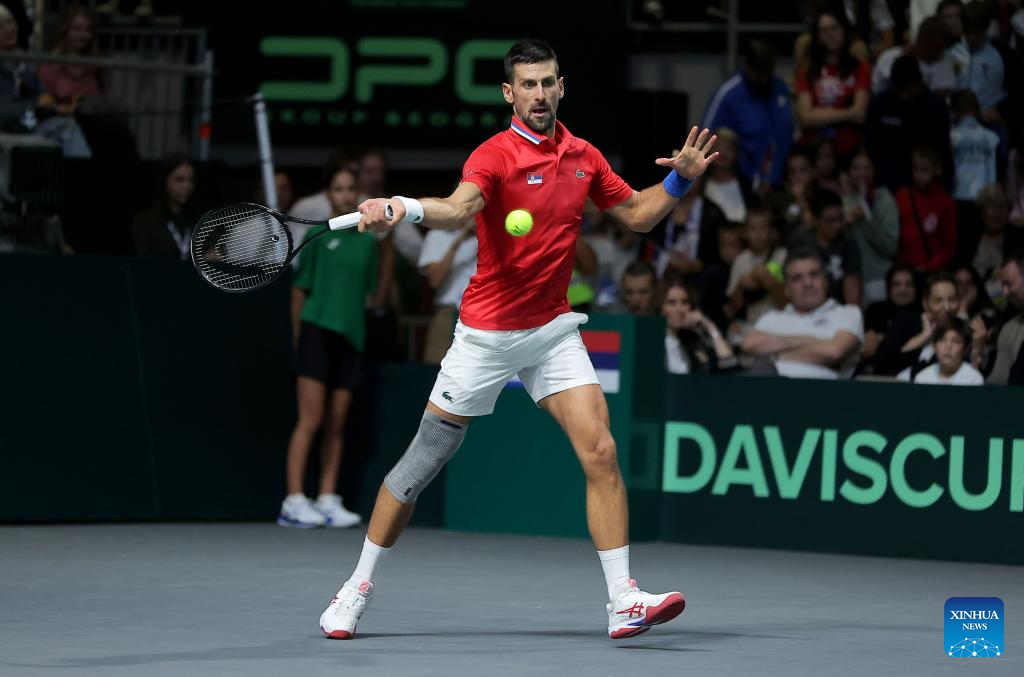 BELGRADO, 15 septiembre, 2024 (Xinhua) -- Imagen del 14 de septiembre de 2024 de Novak Djokovic, de Serbia, devolviendo la pelota a Ioannis Xilas, de Grecia, durante el partido de tenis del Grupo Mundial 1 de la Copa Davis entre Serbia y Grecia, en Belgrado, Serbia. (Xinhua/Predrag Milosavljevic)