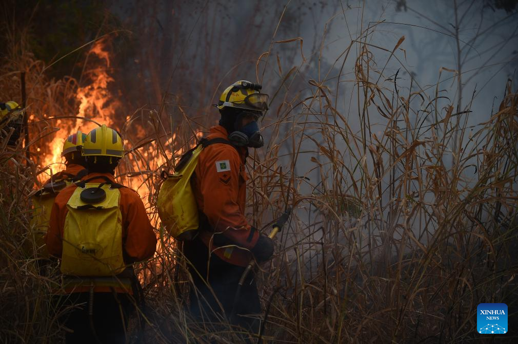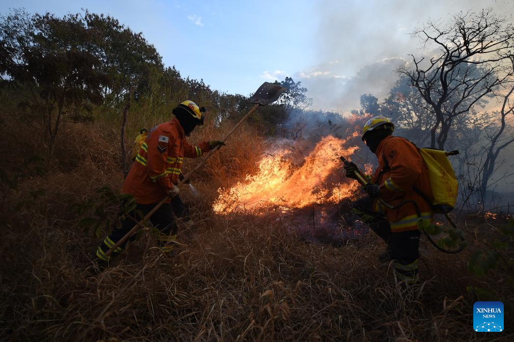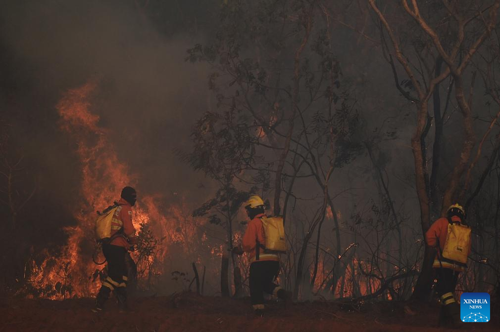 BRASILIA, 16 septiembre, 2024 (Xinhua) -- Bomberos combaten un incendio forestal en el Parque Nacional de Brasilia, en Brasilia, Brasil, el 16 de septiembre de 2024. La capital brasileña amaneció el lunes cubierta de ceniza y con una densa capa de humo debido al intenso incendio que se registra desde el domingo en el Parque Nacional de Brasilia, donde el fuego ya consumió más de 1.200 hectáreas y dejó a varios bomberos heridos, informaron las autoridades locales. (Xinhua/Lucio Tavora)