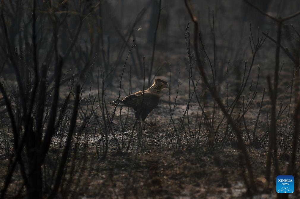 BRASILIA, 16 septiembre, 2024 (Xinhua) -- Un ave es vista en una zona afectada por un incendio forestal, en el Parque Nacional de Brasilia, en Brasilia, Brasil, el 16 de septiembre de 2024. La capital brasileña amaneció el lunes cubierta de ceniza y con una densa capa de humo debido al intenso incendio que se registra desde el domingo en el Parque Nacional de Brasilia, donde el fuego ya consumió más de 1.200 hectáreas y dejó a varios bomberos heridos, informaron las autoridades locales. (Xinhua/Lucio Tavora)