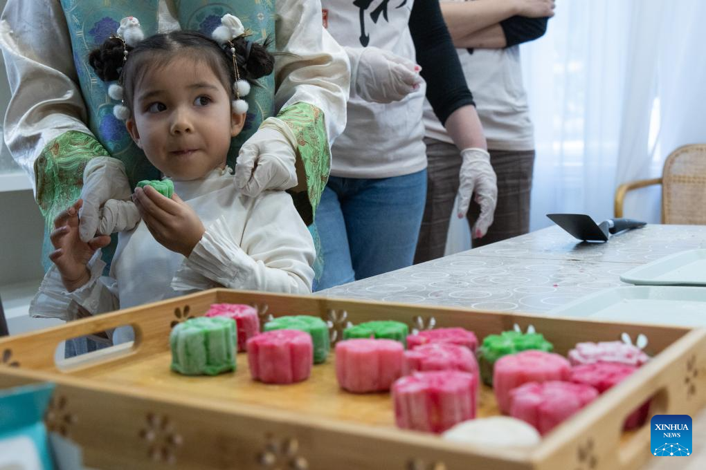 BUDAPEST, 15 septiembre, 2024 (Xinhua) -- Imagen el 14 de septiembre de 2024 de una niña probando un pastel de luna durante un taller en celebración del Festival de Medio Otoño en el Centro Cultural de China, en Budapest, Hungría. (Xinhua/Attila Volgyi)