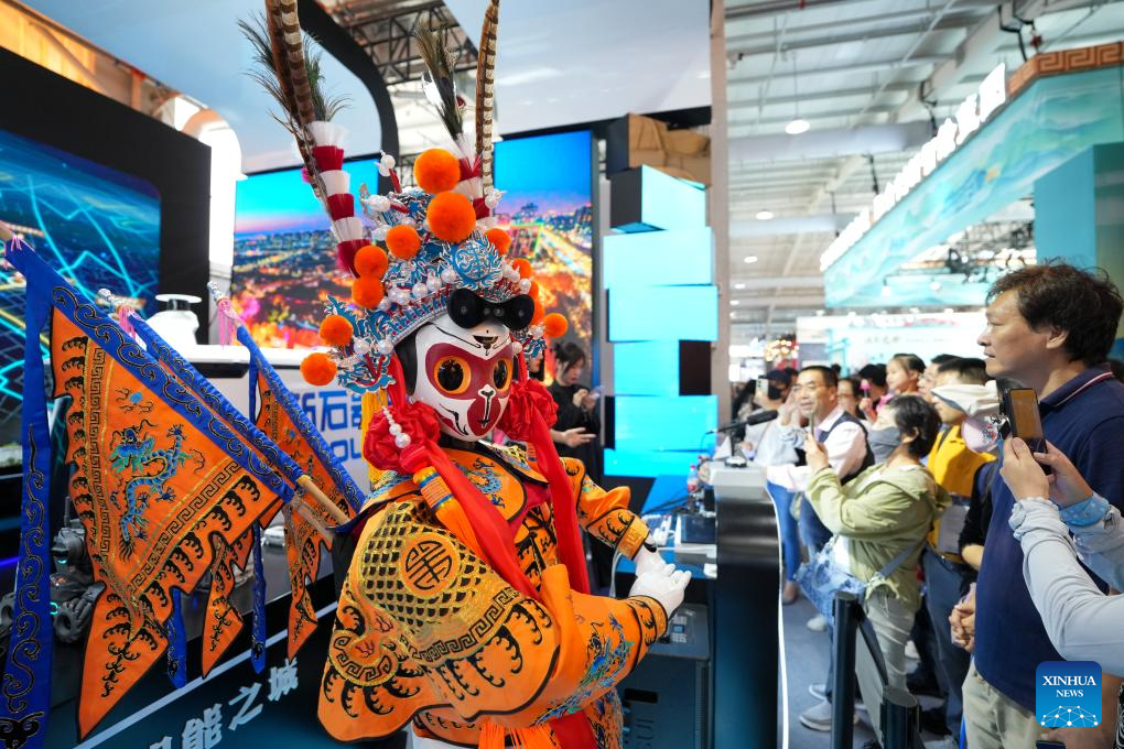 BEIJING, 16 septiembre, 2024 (Xinhua) -- Imagen del 15 de septiembre de 2024 de un robot humanoide interpretando ópera visto durante la Feria Internacional de Comercio de Servicios de China 2024 (CIFTIS, por sus siglas en inglés), en el área de exposición temática de Servicios Culturales y Turísticos, en el Parque Shougang, en Beijing, capital de China. El área de exposición temática de Servicios Culturales y Turísticos de la CIFTIS de este año refleja la integración de la tecnología y la cultura. Las exposiciones permiten presentaciones multidimensionales con nuevas tecnologías como espacios digitales inmersivos, realidad virtual (RV), realidad aumentada (RA) y proyección holográfica. (Xinhua/Ju Huanzong)