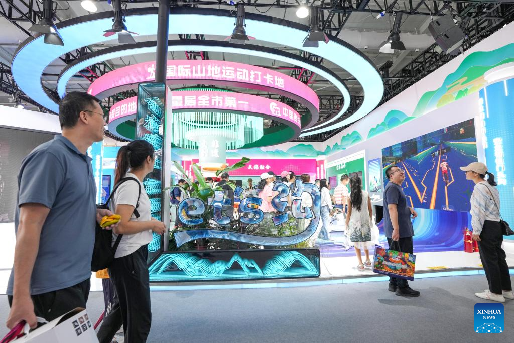 BEIJING, 16 septiembre, 2024 (Xinhua) -- Imagen del 15 de septiembre de 2024 de visitantes caminando frente al estand del distrito de Mentougou de Beijing durante la Feria Internacional de Comercio de Servicios de China 2024 (CIFTIS, por sus siglas en inglés), en el área de exposición temática de Servicios Culturales y Turísticos, en el Parque Shougang, en Beijing, capital de China. El área de exposición temática de Servicios Culturales y Turísticos de la CIFTIS de este año refleja la integración de la tecnología y la cultura. Las exposiciones permiten presentaciones multidimensionales con nuevas tecnologías como espacios digitales inmersivos, realidad virtual (RV), realidad aumentada (RA) y proyección holográfica. (Xinhua/Chen Yehua)