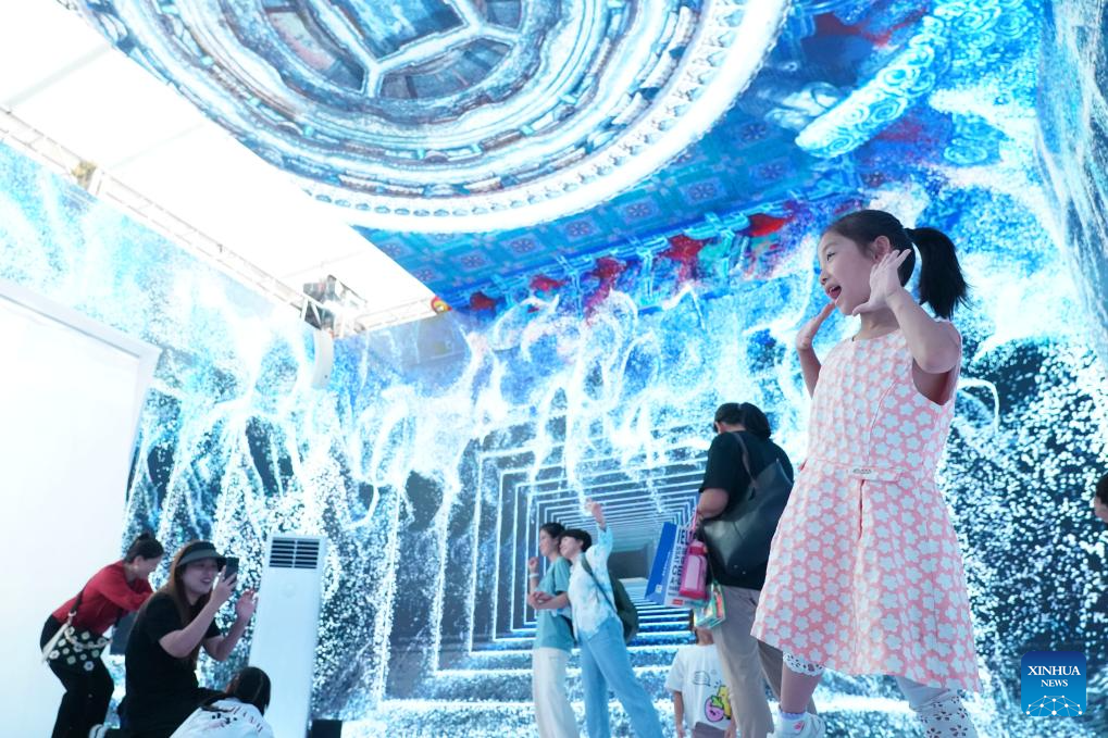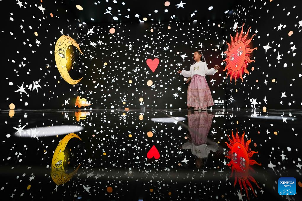 BEIJING, 16 septiembre, 2024 (Xinhua) -- Imagen del 15 de septiembre de 2024 de una niña sumergiéndose en una exposición digital de arte durante la Feria Internacional de Comercio de Servicios de China 2024 (CIFTIS, por sus siglas en inglés), en el área de exposición temática de Servicios Culturales y Turísticos, en el Parque Shougang, en Beijing, capital de China. El área de exposición temática de Servicios Culturales y Turísticos de la CIFTIS de este año refleja la integración de la tecnología y la cultura. Las exposiciones permiten presentaciones multidimensionales con nuevas tecnologías como espacios digitales inmersivos, realidad virtual (RV), realidad aumentada (RA) y proyección holográfica. (Xinhua/Ju Huanzong)