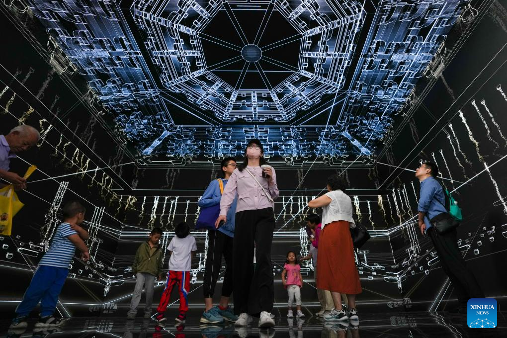 BEIJING, 16 septiembre, 2024 (Xinhua) -- Imagen del 15 de septiembre de 2024 de visitantes sumergiéndose en una exposición digital de arte durante la Feria Internacional de Comercio de Servicios de China 2024 (CIFTIS, por sus siglas en inglés), en el área de exposición temática de Servicios Culturales y Turísticos, en el Parque Shougang, en Beijing, capital de China. El área de exposición temática de Servicios Culturales y Turísticos de la CIFTIS de este año refleja la integración de la tecnología y la cultura. Las exposiciones permiten presentaciones multidimensionales con nuevas tecnologías como espacios digitales inmersivos, realidad virtual (RV), realidad aumentada (RA) y proyección holográfica. (Xinhua/Ju Huanzong)