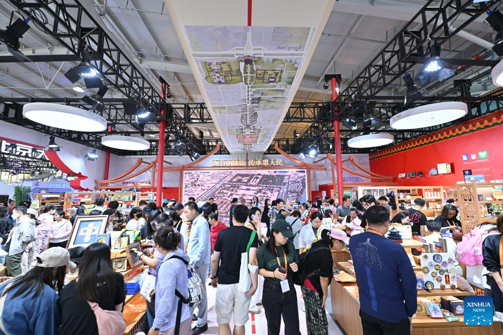 BEIJING, 16 septiembre, 2024 (Xinhua) -- Personas visitan el estand de la Oficina Municipal de Patrimonio Cultural de Beijing durante la Feria Internacional de Comercio de Servicios de China 2024 (CIFTIS, por sus siglas en inglés), en el Parque Shougang, en Beijing, capital de China, el 16 de septiembre de 2024. El área de exposición temática de Servicios Culturales y Turísticos de la CIFTIS de este año refleja la integración de la tecnología y la cultura. Las exposiciones permiten presentaciones multidimensionales con nuevas tecnologías como espacios digitales inmersivos, realidad virtual (RV), realidad aumentada (RA) y proyección holográfica. (Xinhua/Li Xin)