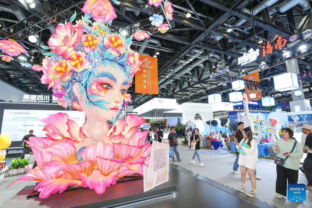 BEIJING, 16 septiembre, 2024 (Xinhua) -- Imagen del 14 de septiembre de 2024 de personas observando instalaciones de luz en el estand de la provincia de Sichuan durante la Feria Internacional de Comercio de Servicios de China 2024 (CIFTIS, por sus siglas en inglés), en el Centro Nacional de Convenciones de China, en Beijing, capital de China. El área de exposición temática de Servicios Culturales y Turísticos de la CIFTIS de este año refleja la integración de la tecnología y la cultura. Las exposiciones permiten presentaciones multidimensionales con nuevas tecnologías como espacios digitales inmersivos, realidad virtual (RV), realidad aumentada (RA) y proyección holográfica. (Xinhua/Chen Yehua)