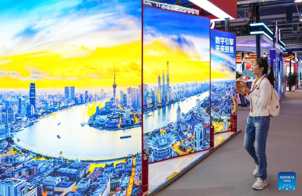 BEIJING, 16 septiembre, 2024 (Xinhua) -- Una visitante camina frente al estand de Shanghai durante la Feria Internacional de Comercio de Servicios de China 2024 (CIFTIS, por sus siglas en inglés), en el Centro Nacional de Convenciones de China, en Beijing, capital de China, el 16 de septiembre de 2024. El área de exposición temática de Servicios Culturales y Turísticos de la CIFTIS de este año refleja la integración de la tecnología y la cultura. Las exposiciones permiten presentaciones multidimensionales con nuevas tecnologías como espacios digitales inmersivos, realidad virtual (RV), realidad aumentada (RA) y proyección holográfica. (Xinhua/Chen Yehua)