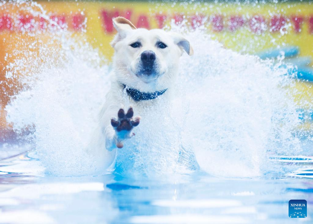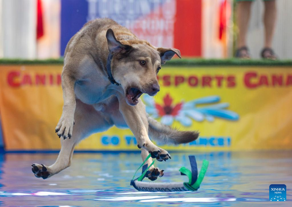 TORONTO, 16 septiembre, 2024 (Xinhua) -- Imagen del 15 de septiembre de 2024 de un perro saltando a una piscina para atrapar un juguete lanzado durante un evento de salto desde el muelle en el Festival Waterfront 2024, en Toronto, Canadá. El salto desde el muelle es un deporte en el que perros ágiles compiten por premios saltando una distancia considerable desde un muelle a una piscina de agua. (Xinhua/Zou Zheng)