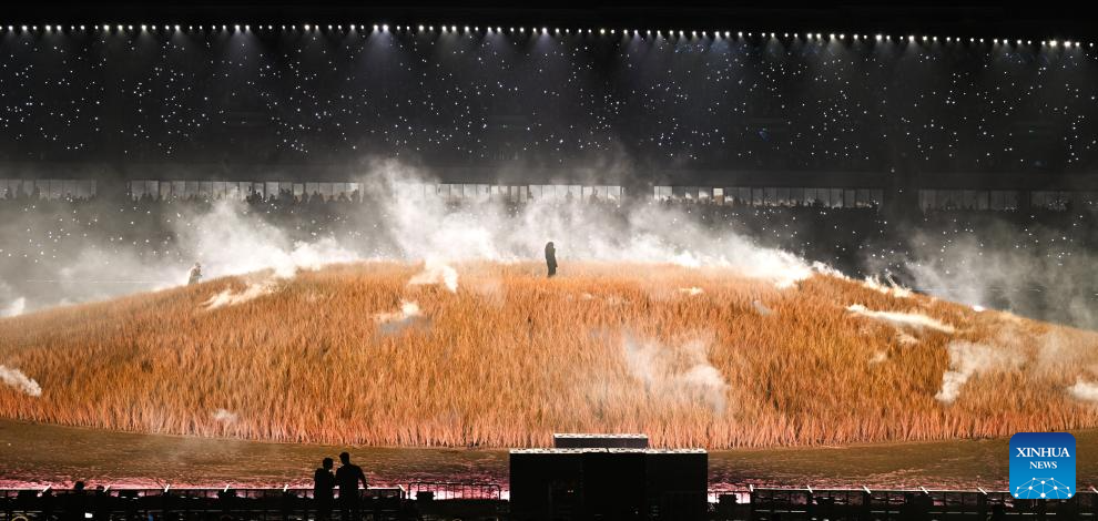 HAIKOU, 17 septiembre, 2024 (Xinhua) -- Imagen del 15 de septiembre de 2024 del escenario del concierto "World Tour Listening Party" del rapero estadounidense, Kanye West, en Haikou, capital de la provincia de Hainan, en el sur de China. Kanye West hizo vibrar el domingo el Estadio Wuyuanhe, en Haikou, capital de la provincia insular de Hainan, en el sur de China, con un espectáculo de música en vivo que no solo entusiasmó a sus aficionados, sino que también ocasionó un aumento en la economía del turismo vacacional local. (Xinhua)
