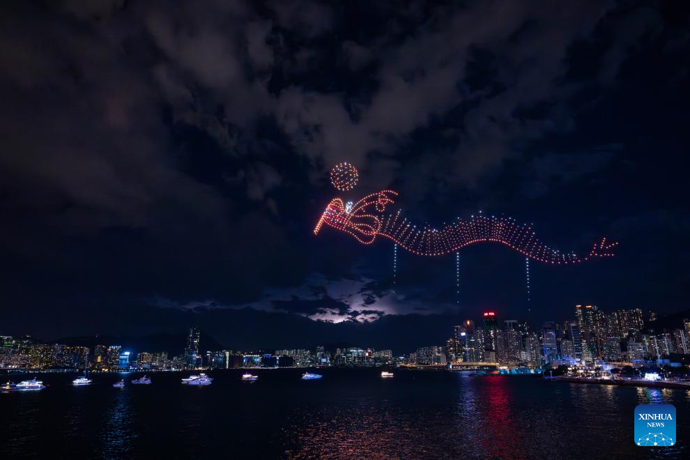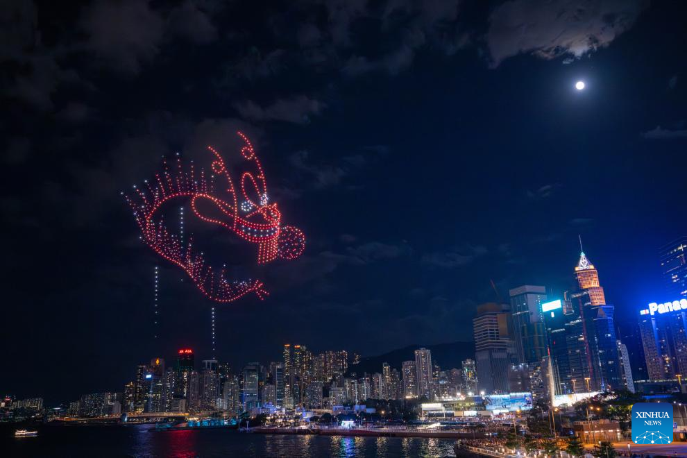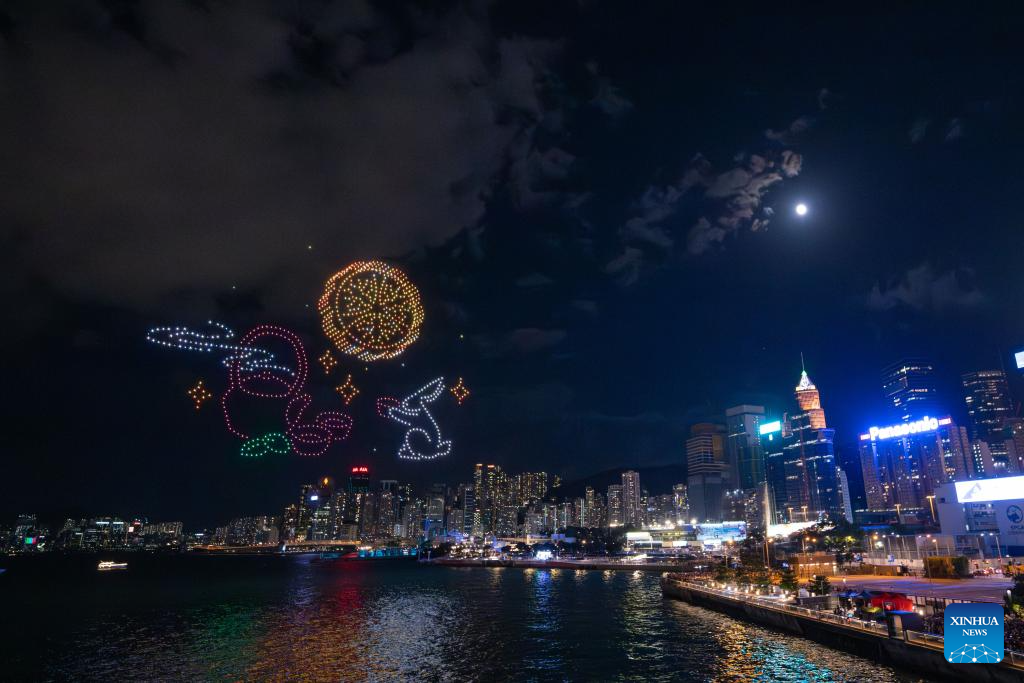 HONG KONG, 17 septiembre, 2024 (Xinhua) -- Un espectáculo de luces con drones en celebración del Festival de Medio Otoño se lleva a cabo en Hong Kong, en el sur de China, el 17 de septiembre de 2024. (Xinhua/Zhu Wei)