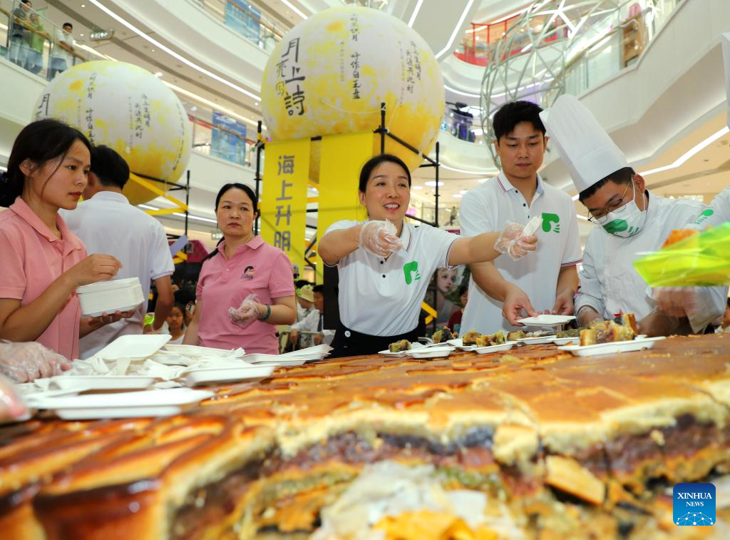 BEIJING, 17 septiembre, 2024 (Xinhua) -- Empleados de un centro comercial distribuyen pasteles de luna a turistas, en Nanyang, en la provincia de Henan, en el centro de China, el 17 de septiembre de 2024. Los chinos disfrutaron de tres días de vacaciones por el Festival de Medio Otoño, que este año cayó el 17 de septiembre. (Xinhua/Gao Song)