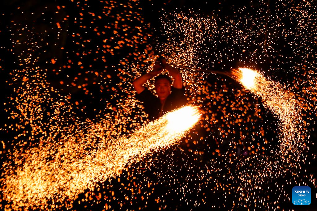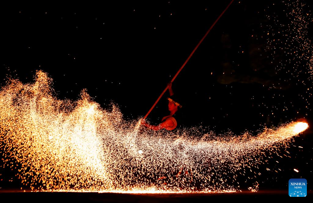 BEIJING, 17 septiembre, 2024 (Xinhua) -- Imagen del 16 de septiembre de 2024 de un artista folclórico realizando la danza de la flor de carbón, creando chispas al quemar carbón, para los turistas, en el distrito de Xiuning, en la ciudad de Huangshan, en la provincia de Anhui, en el este de China. Los chinos disfrutaron de tres días de vacaciones por el Festival de Medio Otoño, que este año cayó el 17 de septiembre. (Xinhua/Shi Yalei)