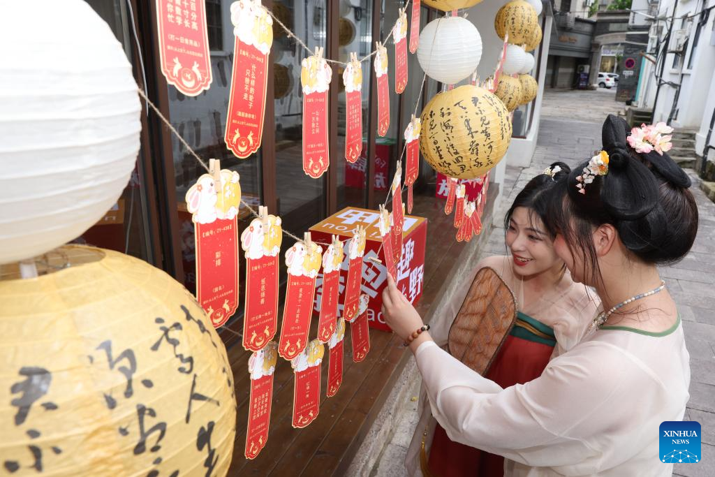 BEIJING, 17 septiembre, 2024 (Xinhua) -- Turistas leen acertijos de linternas, en el poblado de Qianyuan del distrito de Deqing, en la ciudad de Huzhou, en la provincia de Zhejiang, en el este de China, el 17 de septiembre de 2024. Los chinos disfrutaron de tres días de vacaciones por el Festival de Medio Otoño, que este año cayó el 17 de septiembre. (Xinhua/Ni Lifang)