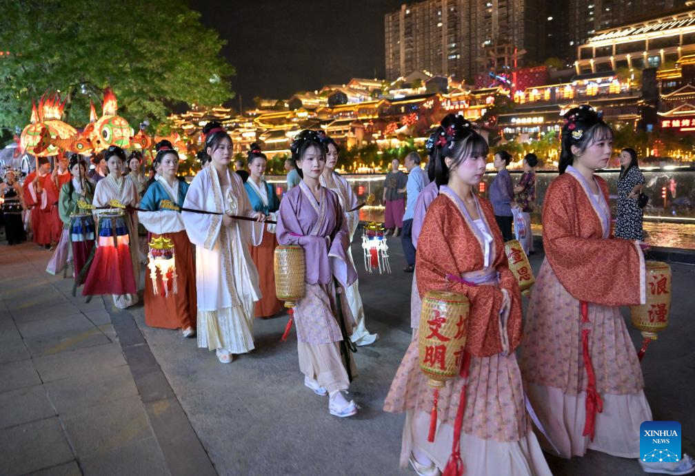BEIJING, 17 septiembre, 2024 (Xinhua) -- Imagen del 16 de septiembre de 2024 de personas vestidas con trajes chinos antiguos asistiendo a un desfile, en el distrito de Xuan'en, en la provincia de Hubei, en el centro de China. Los chinos disfrutaron de tres días de vacaciones por el Festival de Medio Otoño, que este año cayó el 17 de septiembre. (Xinhua/Song Wen)